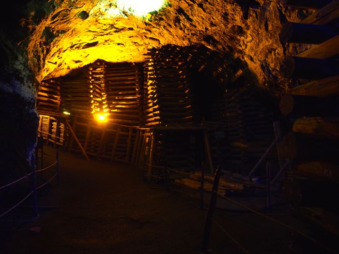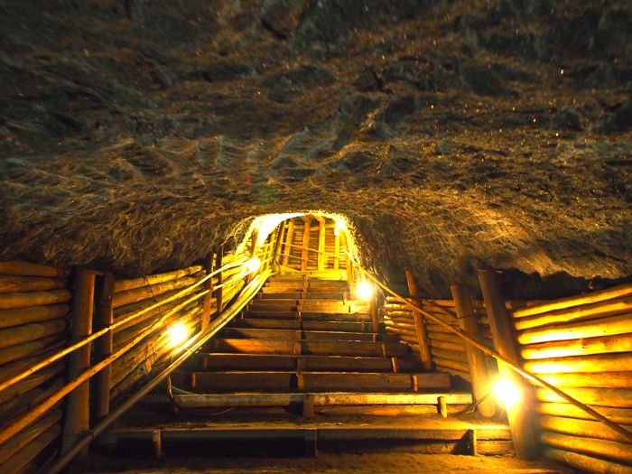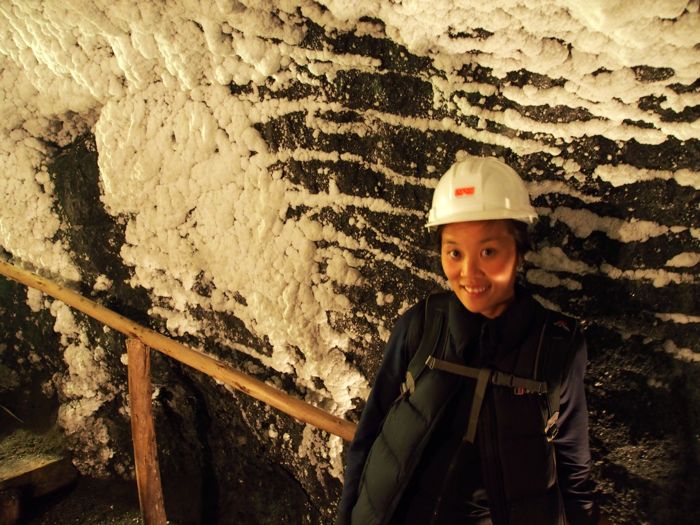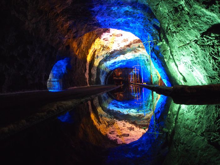 The high salt content in the mine’s waterway creates a glassy surface that makes it hard to determine where the walls finish and the water starts.