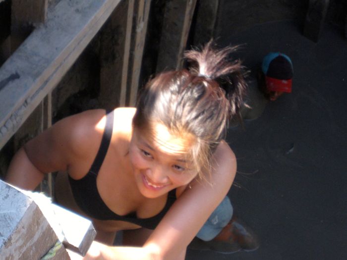 Alice climbs down the ladder into the pit towards the mud masseurs.